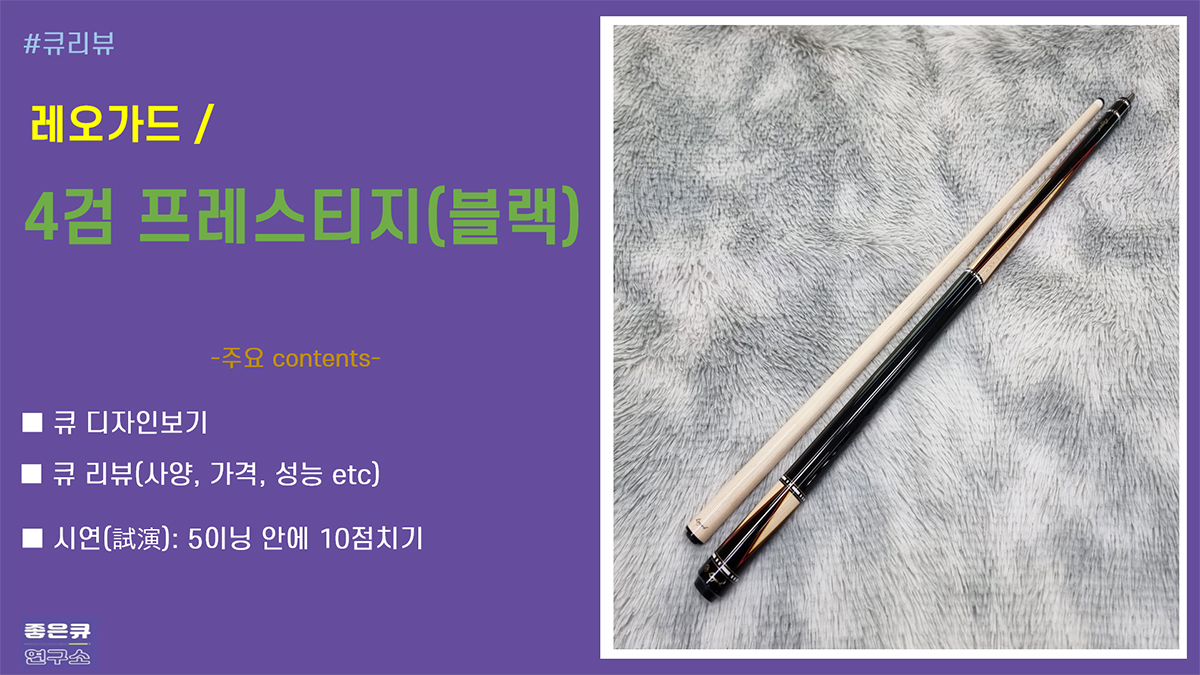 에버2_레오가드_4검프레스티지(블랙).jpg 485.35 KB ■ 리뷰영상 youtube:u1pkJS5dpW4 *contents-큐 소개 (디자인 보기 및 큐 소개)-시연영상(PBA초구 배치 후 흰 공을 수구로 5이닝 안에 10점 내기) ■ 성능평가표 성능평가표_레오가드_4검프레스티지(블랙_와인).png 130.37 KB - (참고) 큐 평가기준 및 평가방법 http://goodcue.co.kr/cueblog/3 ■ 큐 상세 https://goodcue.c